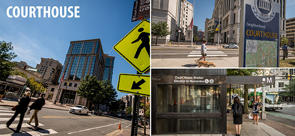 Courthouse se encuentra entre Clarendon y Rosslyn. Courthouse es el hogar de los tribunales del Condado de Arlington, el departamento de policía y las oficinas administrativas, así como también restaurantes, tiendas, hoteles y oficinas y edificios residenciales. Además de contar con la línea Naranja la línea Plateada de Metrorail, Courthouse cuenta con varias rutas de Metrobus y ART. Las calles Wilson Boulevard, Clarendon Boulevard, Barton y Veitch tienen carriles para bicicletas en la calle que conectan Courthouse con otros vecindaros y con el sendero Custis. Al igual que con otros vecindarios a lo largo de este corredor, tranquilas calles residenciales se encuentran a tan solo pocos pasos de la estación de Metro.